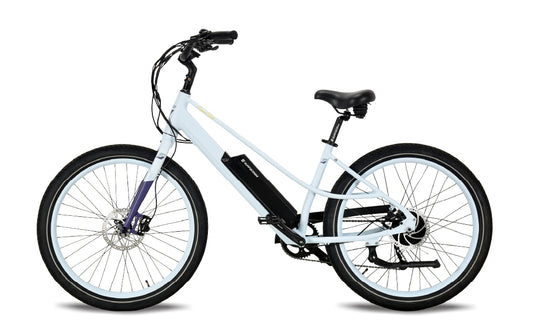 The Surface 604 Sunny Day Low-Step Cruiser is built for comfort and style on city streets and bike paths. With its easy-entry frame, upright cruiser handlebars, and 500 W hub motor paired with long-range battery options, it delivers smooth power and relaxed riding for commutes or leisure rides. Hydraulic disc brakes, wide 27.5″ tires, and a cushioned saddle ensure a safe, comfortable cruise every time.